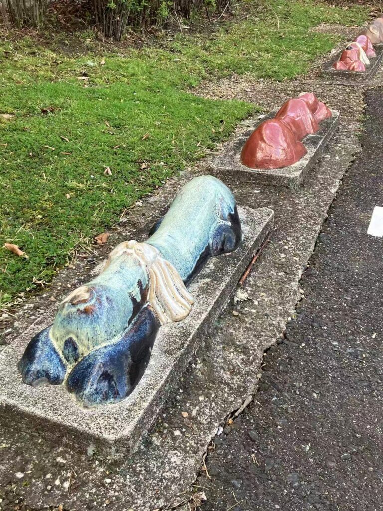 赤色と青色のワンちゃんがセットですべての車止めの位置にいてとても可愛かったです。